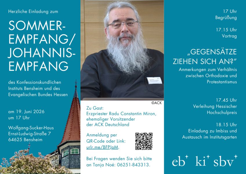 Nicht nur für Mitglieder, sondern für alte und neue Bekannte des Evangelischen Bundes Hessen und des Konfessionskundlichen Institutes Bensheim laden wir gemeinsam zum diesjährigen Empfang nach Bensheim ein.